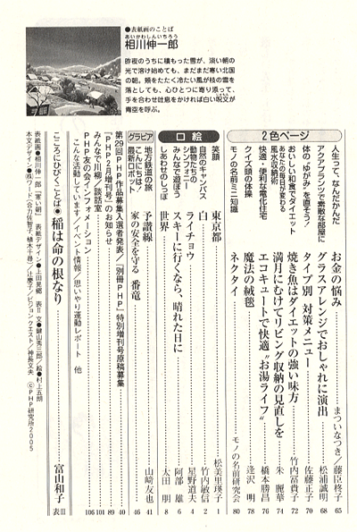 『PHP』誌は、PHPの考え方を広く世に伝えるための、いわば機関誌であり、PHP研究所設立とともに創刊されました。『PHP』では、人間とは何か、真に豊かな人生とは何か、幸福とは何か、といった、いつの時代にも変わらぬ人類普遍のテーマである「生き方」について、身近な角度からとりあげています。多くの方々の体験にもとづく貴重な意見・提言をもとに、物の見方・考え方についてのヒントを小・中学生からお年寄りまで多くの読者とともに考える広場になっています。