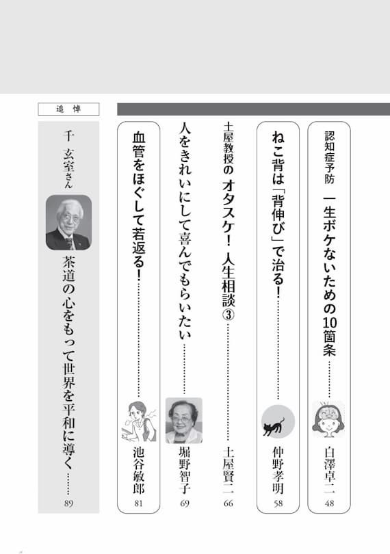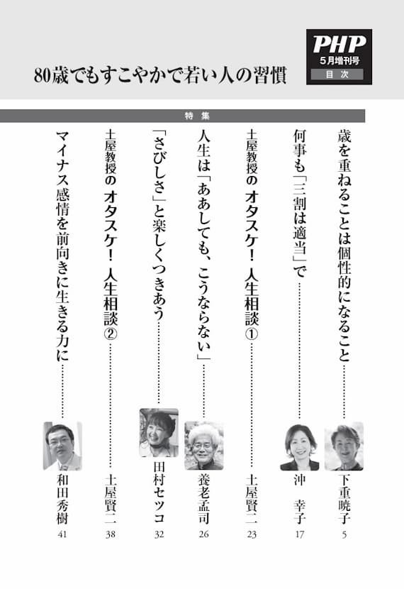 「人生100年時代」といわれる今、80歳を超えて長生きすることは珍しくなくなっています。せっかく長生きするなら、元気に動けて、ボケることなく、毎日を明るく楽しく充実して過ごしたいもの。 本増刊号では、これまでに月刊誌『PHP』で掲載された記事の中から、主に80歳以上の方の記事を選りすぐり、再編集しました。さまざまな視点から、「80歳でもすこやかで若い人の習慣」をご紹介します。 |
