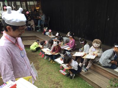 11月11日(日)まで、絵本『いもむしパン』とのコラボフェア開催中の「ひぐらしガーデン」。ここが今回の会場です。パン屋である「ひぐらしベーカリー」と、本屋である「パン屋の本屋」の間にある素敵な中庭に、子どもたちが集まってくれました。まずは、みんなの気持ちをひとつに☆ということで、参加者にいもむしパンのお面を配布。大喜びの子どもたちと、その様子を写真に撮るお母様方。一気に場の雰囲気が温まりました。